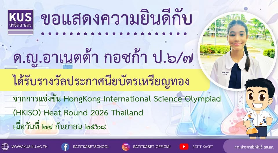 ขอแสดงความยินดีแก่เด็กหญิงอาเนตต้า กอซก้า ป.๖/๗ ได้เข้าร่วมการแข่งขัน “HongKong International Science Olympiad (HKISO) Heat Round 2026 Thailand“